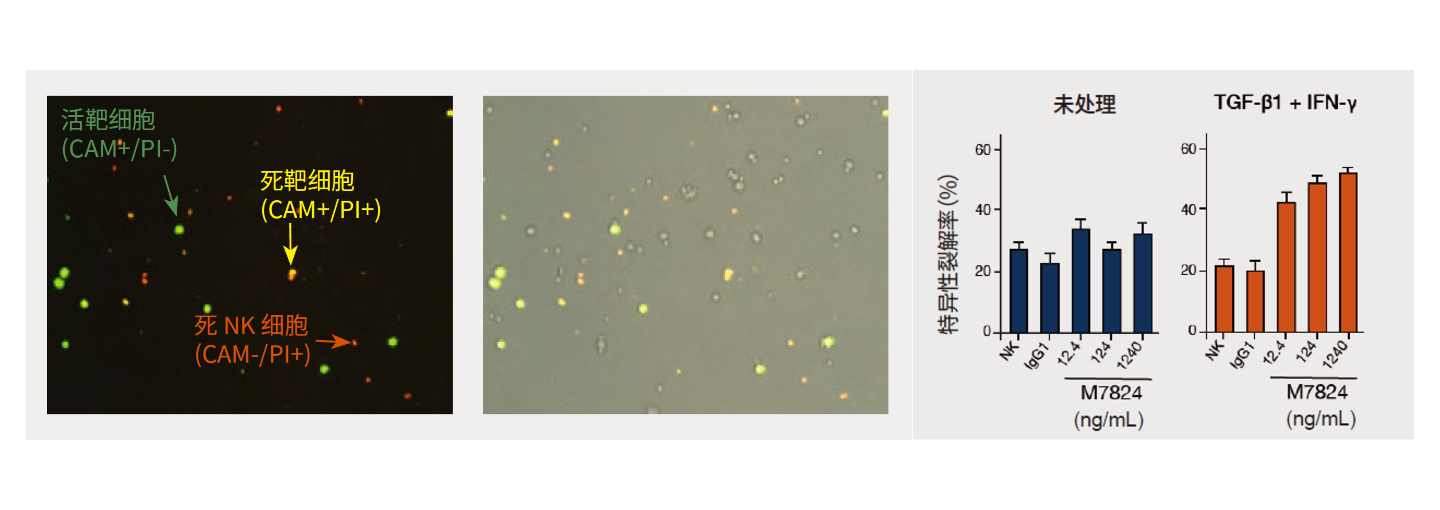 對calcein AM陽性活細胞進行計數,以測定共培養細胞中雙功能融合蛋白(M7824)對NK細胞介導的細胞毒性的影響。