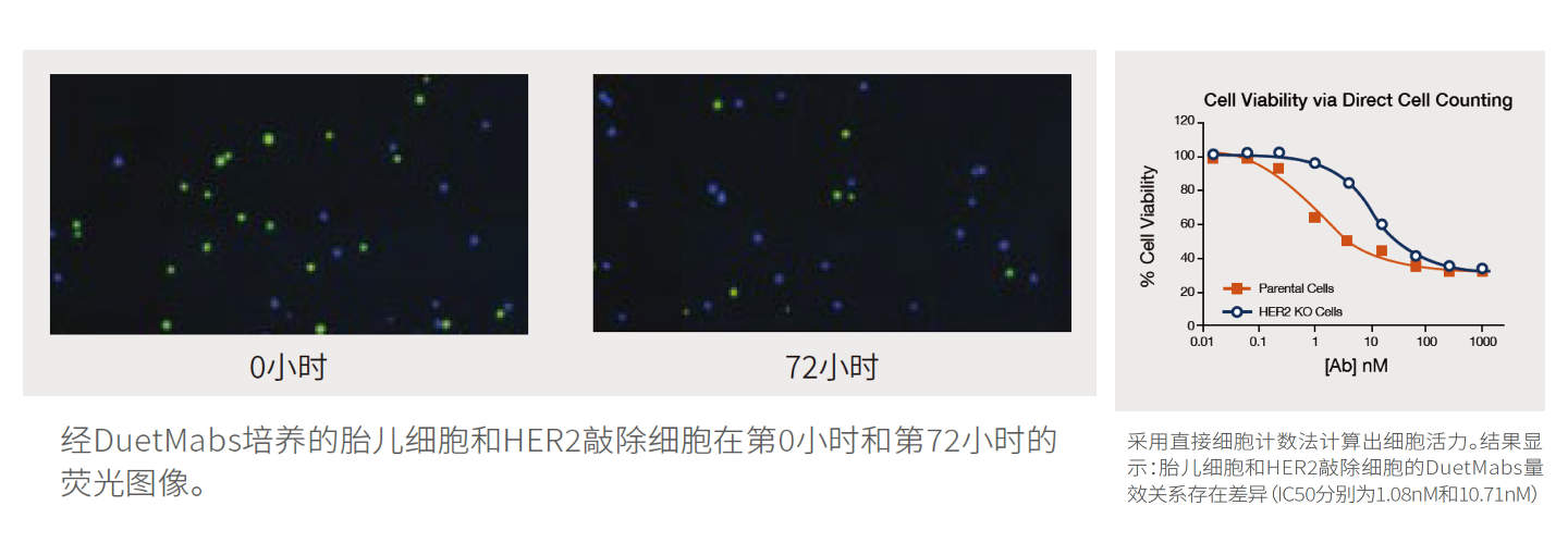 Celigo對胎兒細胞(CellTrackerGreen染色)和HER2敲除細胞(CellTracker Violet染色)的共同培養體系進行直接計數。該實驗研究了單價雙特異lgG(DuetMab)對胎兒細胞和HER2敲除細胞共培養體系的選擇性細胞毒性作用。