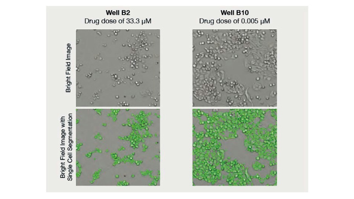 生成的圖像(顯示于左側)來自兩個孔:B2和B10;之后分別按照33.3um和0.005um的劑量對兩個孔進行藥物處理。