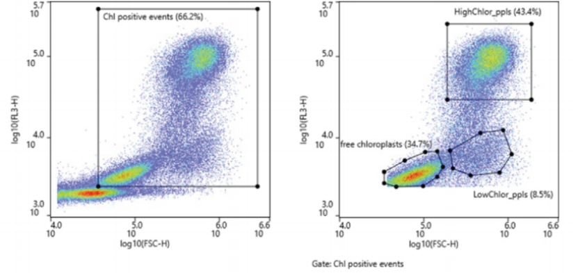 分析預分選樣品時,可以看到游離葉綠體,這表明細胞已經裂解(下圖)。分選后,樣品中則多為未損壞的原生質體。WOLF的低壓分選(< 2 psi)與使用原生質體培養基作為鞘提供了成功選的環境。