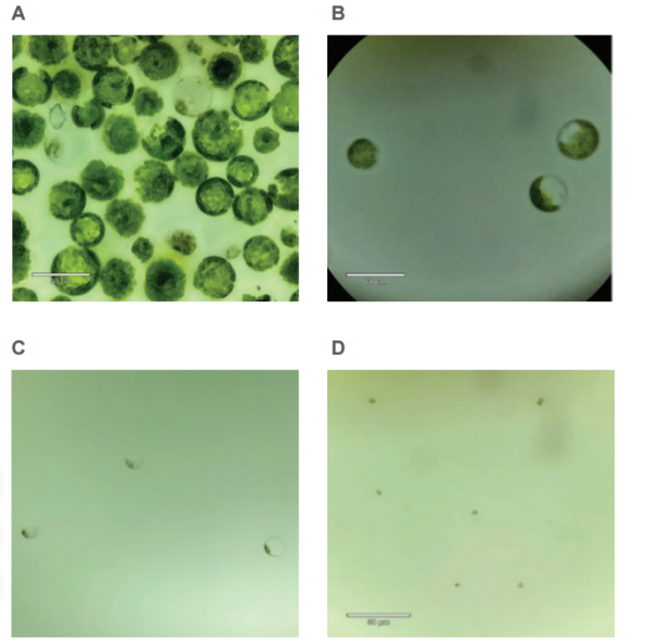 下圖中的顯微鏡檢圖片展示了成功分選的原生質體不同組群。高葉綠素和低葉綠素原生質體群體的大小范圍相同:30-50 微米;而葉綠體則小得多,約為 10 微米。下圖中,圖A為分選前的樣本,B為分選出的含高葉綠素的原生質體,C為分選出的含低葉綠素的原生質體,D為分選出的葉綠體。