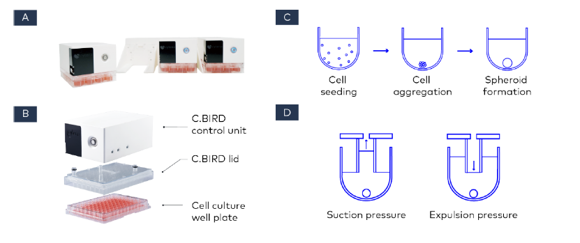 盡管球體培養適合高通量篩選,并且可以在多孔板中進行規模放大,但在生成高質量球體方面仍存在局限性。我們在此展示了利用 C.BIRD 微生物反應器(圖 1A)進行大量球體培養的創新培養方法。C.BIRD 由一個自主控制單元和一個帶有 24 或 96 個流體通道的 C.BIRD 蓋子組成(圖 1B)。在本研究中,我們使用超低附著(ULA)圓底板對人結腸癌細胞系 HCT116 進行球體形成分析(圖 1C)。將培養板轉移到 C.BIRD 設備后,蓋子的氣動連接提供了低剪切力可調混合,以實現培養均勻化(圖 1D)。通過使用這種特定的培養系統,我們證明了與靜態培養形成的球體相比,球體形成和細胞健康維持有了顯著改善。我們的新技術為優化球體培養環境提供了思路,并克服了生成高質量球體的障礙。