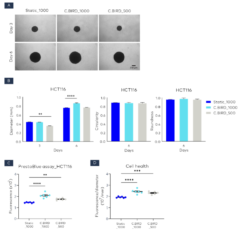 圖2 比較在 96 孔超低附著板中靜態培養和 C.BIRD 培養條件下結腸癌 HCT116 球體的生長情況和細胞健康狀況。(A)在顯微鏡下觀察 HCT116 腫瘤細胞系從第 3 天到第 10 天形成的球體形態。比例尺 = 0.5 毫米。(B)在 10 天內評估球體的生長動力學、圓度和圓整度。使用 ImageJ 軟件進行分析,數據代表每組六個重復樣本的平均值 ± 標準誤。(C 和 D)使用 PrestoBlue 細胞活力試劑評估球體細胞健康狀況。在球體培養 6、7 和 10 天后,向每個孔中加入 20 微升 PrestoBlue 細胞活力試劑,然后在 37°C 和 5% CO2 條件下再孵育 3 小時,之后在基于熒光的微孔板讀數儀(激發/發射波長約為 560/590 納米)上讀取。細胞活力通過每個組的六個重復樣本的熒光信號來測量。熒光信號通過球體直徑進行標準化;較高的比率(熒光/直徑)表明球體更健康。P 值的顯著性列為:P ≤ 0.01(**),P ≤ 0.001(***)和 P ≤ 0.0001(****)。數據以平均值 ± 標準誤表示。