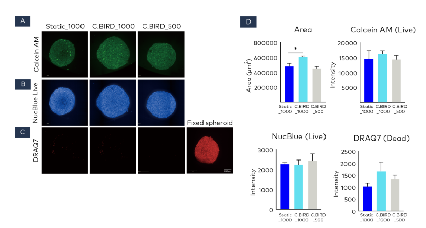 陽性對照中,球體用 4%多聚甲醛固定,作為死細胞。使用 Opera Phenix 高內涵篩選系統以共聚焦模式對球體的熒光進行成像(圖 4A、4B 和 4C)。該圖像是沿 Z 軸每隔 10 微米拍攝的 31 張圖像的最大強度投影,拍攝范圍為 300 微米,使用 10×物鏡。對每個細胞的熒光進行測量并量化為平均強度。Calcein AM/NucBlue Live(活細胞)的平均熒光強度在靜態培養和 C.BIRD 培養之間沒有顯著差異。即使 C.BIRD_1000 的球體大小也大于 Static_1000,C.BIRD_1000 組中 DRAQ7(死細胞)的平均強度也沒有顯著升高(圖 4D)。這些結果表明,即使在較低的細胞接種密度下,C.BIRD 培養方法生成的球體在質量和數量上也與靜態培養相似。