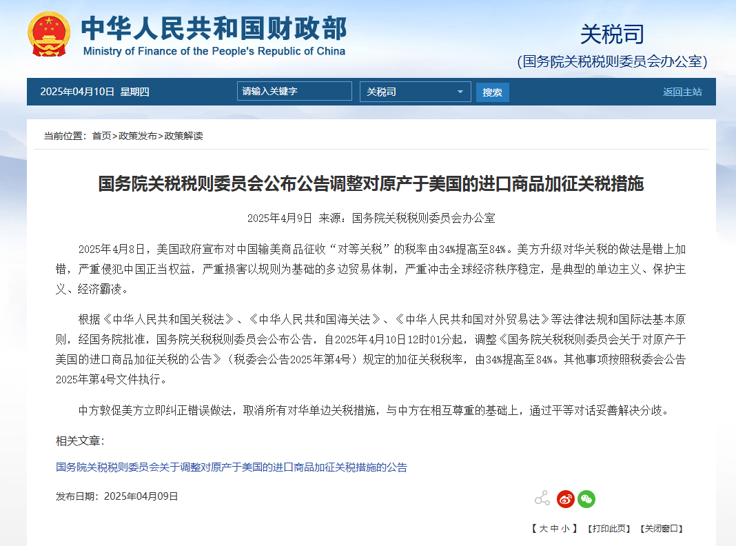 2025年4月9日,就在美國對中國商品加征104%關稅正式生效的同一天,中國財政部發布重磅聲明:自4月10日起,所有美國進口商品將面臨84%的關稅懲罰,相較此前34%的稅率大幅提升。疊加此前對創新藥、醫療器械等領域的多輪關稅調整,生物醫藥產業供應鏈穩定性遭受沖擊,成本壓力與市場不確定性驟增。